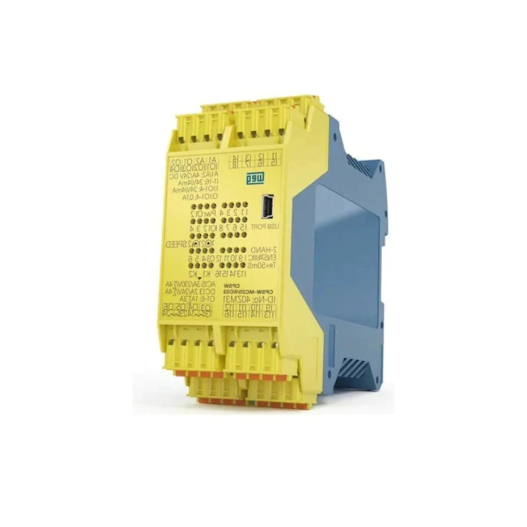 Módulo principal, alimentação 24 V cc (-15% / +10%), com 8 entradas de segurança digitais/analógicas, 8 entradas digitais de segurança (podendo utilizar quatro destas entradas para monitoração de sensor de velocidade 24 V cc), 4 entradas/saídas digitais de segurança a transistor, 6 saídas digitais de segurança a transistor, porta USB.